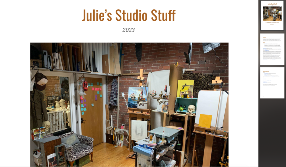 This is a pdf with my most commonly used studio stuff. Easel, cart, lights, brushes, surfaces, etc. I'll also include pics of my current studio set up.